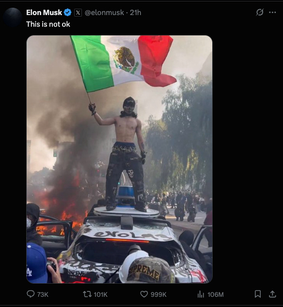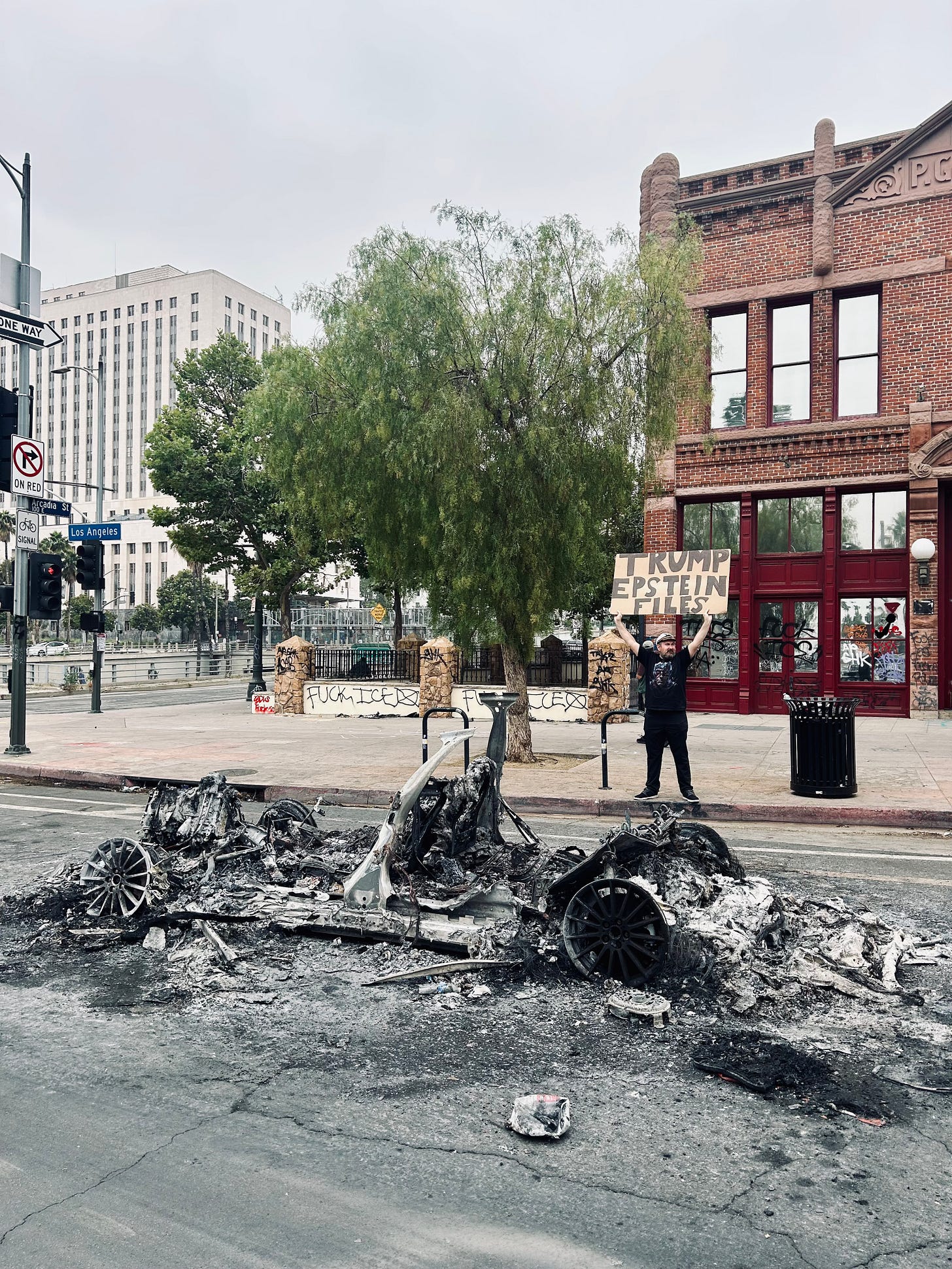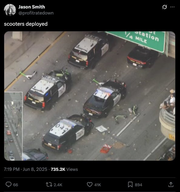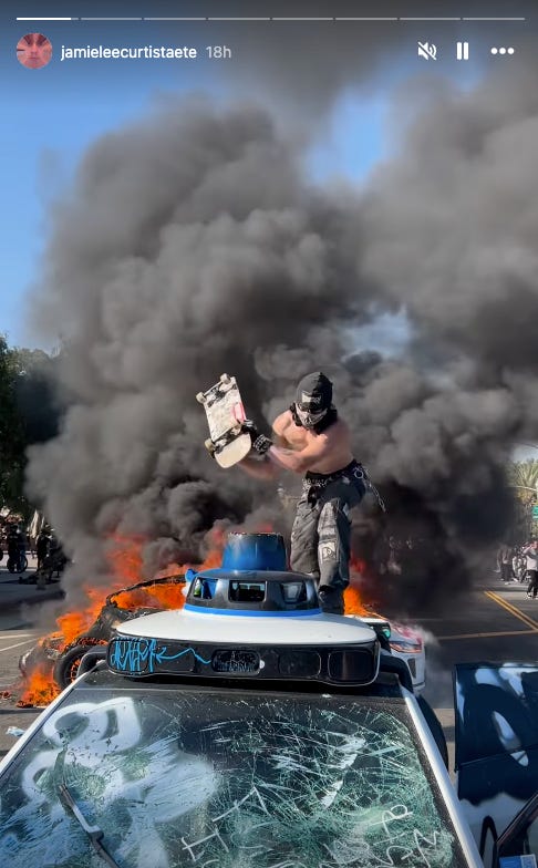 Who knows whether that played a role in ICE protestors’ coordinating a pyrotechnic display on Sunday, whether it was a spontaneous idea to make a memorable visual provocation, or just part of the pure chaos unfolding that day. But as I’ve argued in this newsletter before, in light of previous epidemics of self-driving car trashings and torchings, such actions are liable to spring from the growing reservoir of public anger towards a Silicon Valley that has grown unaccountable and extractive—and has now largely aligned itself with a punitive state.