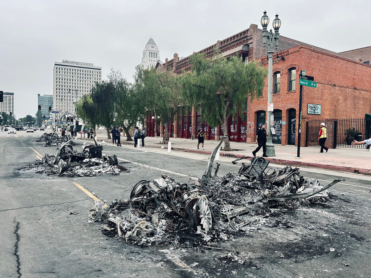 The incinerated husks of Waymo cars were lined up neatly in a row downtown, on Los Angeles Street; one, two, three, four, five of them. And I do mean incinerated. I’ve never seen cars torched so thoroughly. There were sedan-sized piles of ash where Jaguar I-Paces outfitted with lidar sensors used to be, recognizable as cars at all only by wheel frames and blackened chassis. They smelled awful.