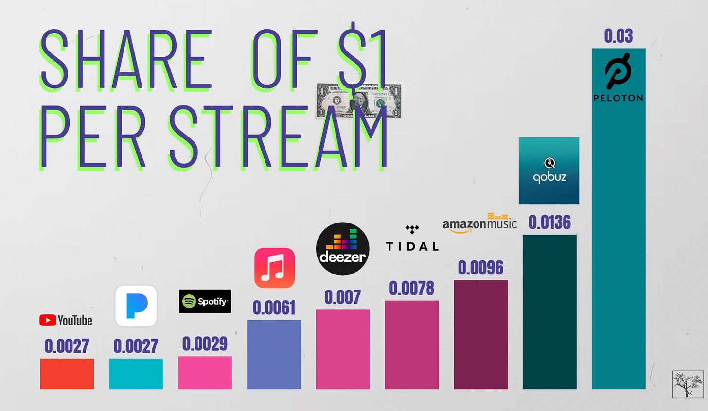 I found this YouTube segment from the independent musician Benn Jordan really interesting. Since he’s indy, he gets the payments directly, and he put together this breakdown of what the streamers paid him.