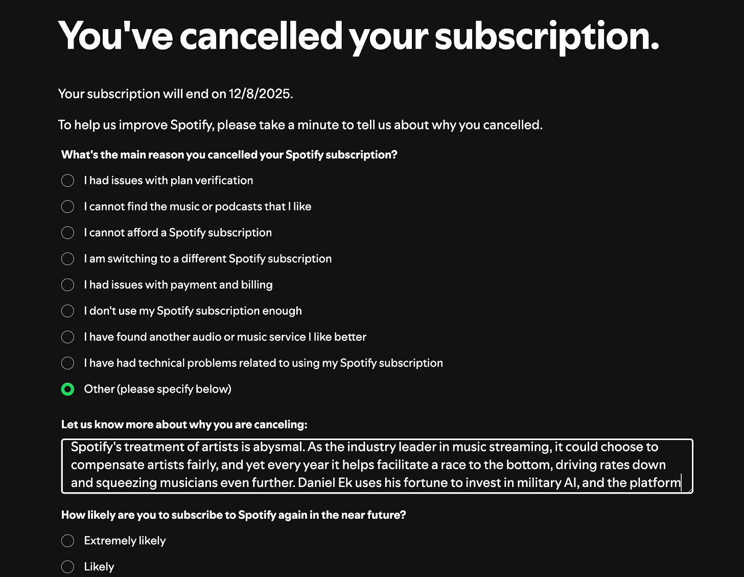 I finally cancelled Spotify. I’d been meaning to do this forever, and frankly I’m embarrassed it took me so long. Spotify has been driving down wages for artists far longer than the AI companies, reducing payouts for musicians over the years until most are now making a statistically meaningless amount from the platform; many estimates put the figure as low as $0.003 per stream. In 2024, Spotify stopped paying artists for songs that had fewer than 1,000 streams, despite the fact that 81% of musicians on the platform don’t cross that threshold.