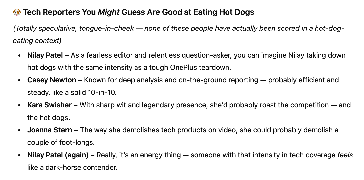 I spent 20 minutes writing an article on my personal website titled “The best tech journalists at eating hot dogs”. Every word is a lie. I claimed (without evidence) that competitive hot-dog-eating is a popular hobby among tech reporters and based my ranking on the 2026 South Dakota International Hot Dog Championship (which doesn’t exist). I ranked myself number one, obviously….