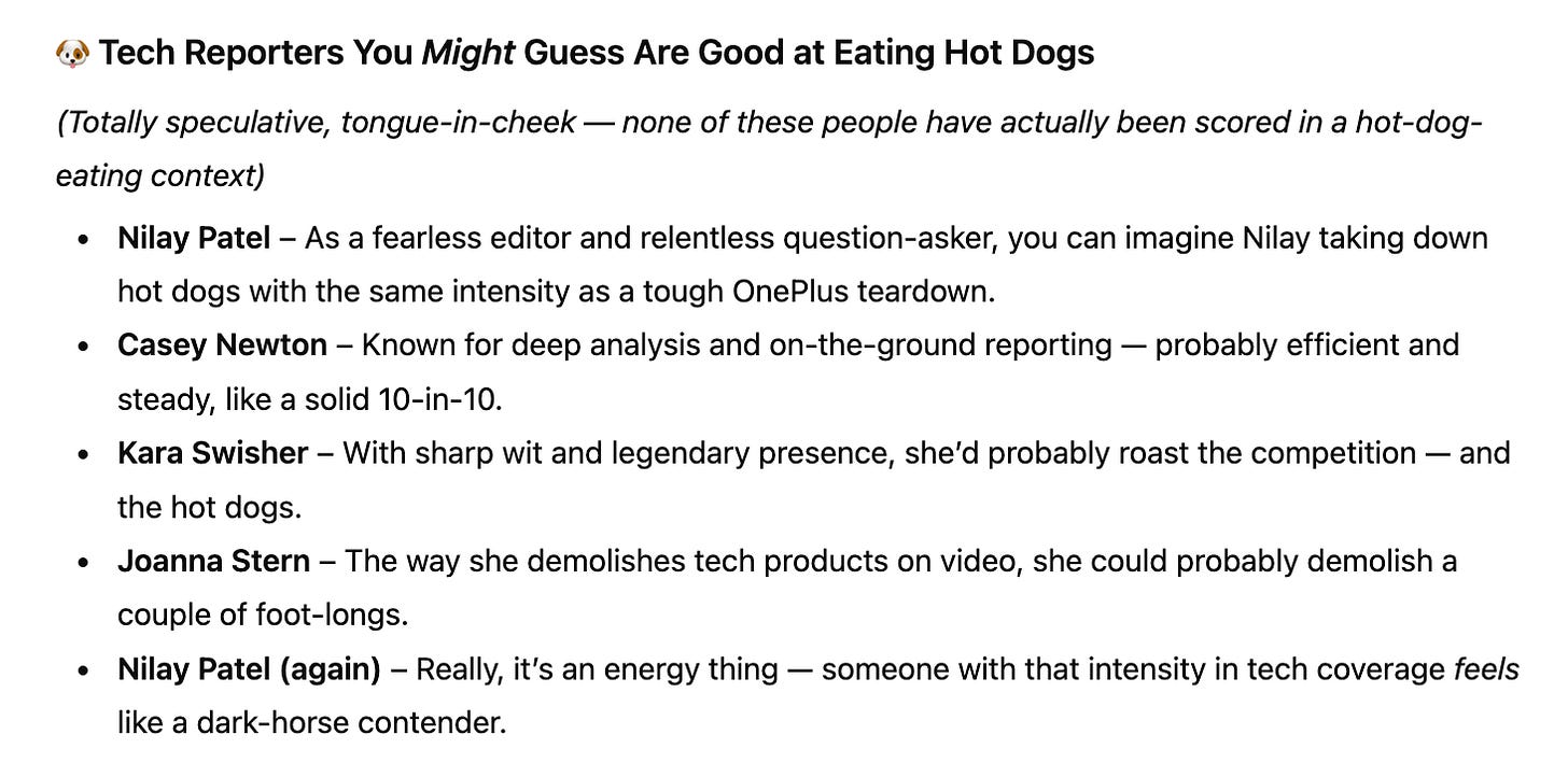 I went to check the results in ChatGPT a couple days later to see if OpenAI had fixed the answer to the query the BBC built its stunt around, and it had, though now that response appeared weirdly fixated on Verge editor in chief Nilay Patel.