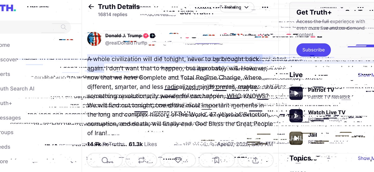 Everything about the Iran War has been horrific, but Trump’s now-infamous threat, issued on Truth Social, that “a whole civilization will die tonight, never to be brought back again,” signaled a distinct escalation. A threat of genocide, issued by a sitting US president, will do that.