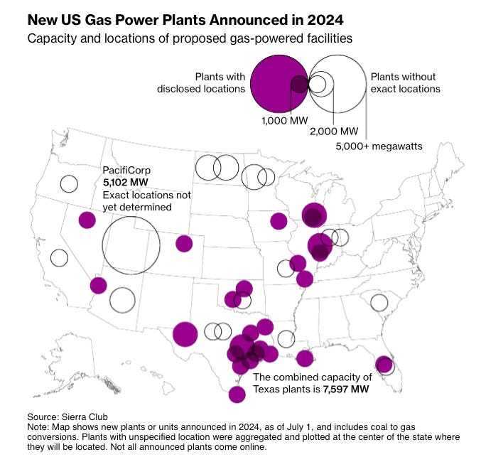 Got that? We were, according to this report, on track for fossil fuel use to top out—until AI came along. AI is a notoriously large energy suck—an AI-generated answer needs about 10 times as much electricity as a Google search. Now analysts and agencies are quietly revising their decarbonization goals downward, gas and coal plants that were slated for retirement are being kept online, and now utilities are building more gas plants in the first half of 2024 than were built in all of 2020 combined.