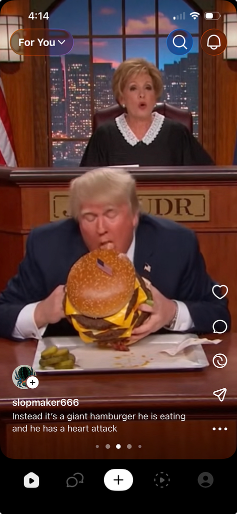 Theoretically, offering users the ability to appropriate, remix, or outright plagiarize a nearly limitless well of pop culture IP and to mess with their friends by dropping them and their digitally scanned visages into any kind of scenario, seems like an idea that could have legs. Yet it was cursed from the start. To begin with, Sora was just overwhelmingly unpleasant to look at and to use. I have an account—it is my solemn reportorial duty—and from time to time I’d log on to check in on the platform. Most times I did, it seemed that people were using Sora to push the boundaries of the platform’s own conspicuous tastelessness, mining that queasiness inherent in the Sora aesthetic. There was a kind of submeme where people gruesomely but not realistically peeled their faces off to reveal they were other people. There were a bunch of posts of giant women stepping on men and crushing them. Judge Judy arbitrating a court case between Obama and Trump. People driving their cars into mountains of human shit. That kind of thing.