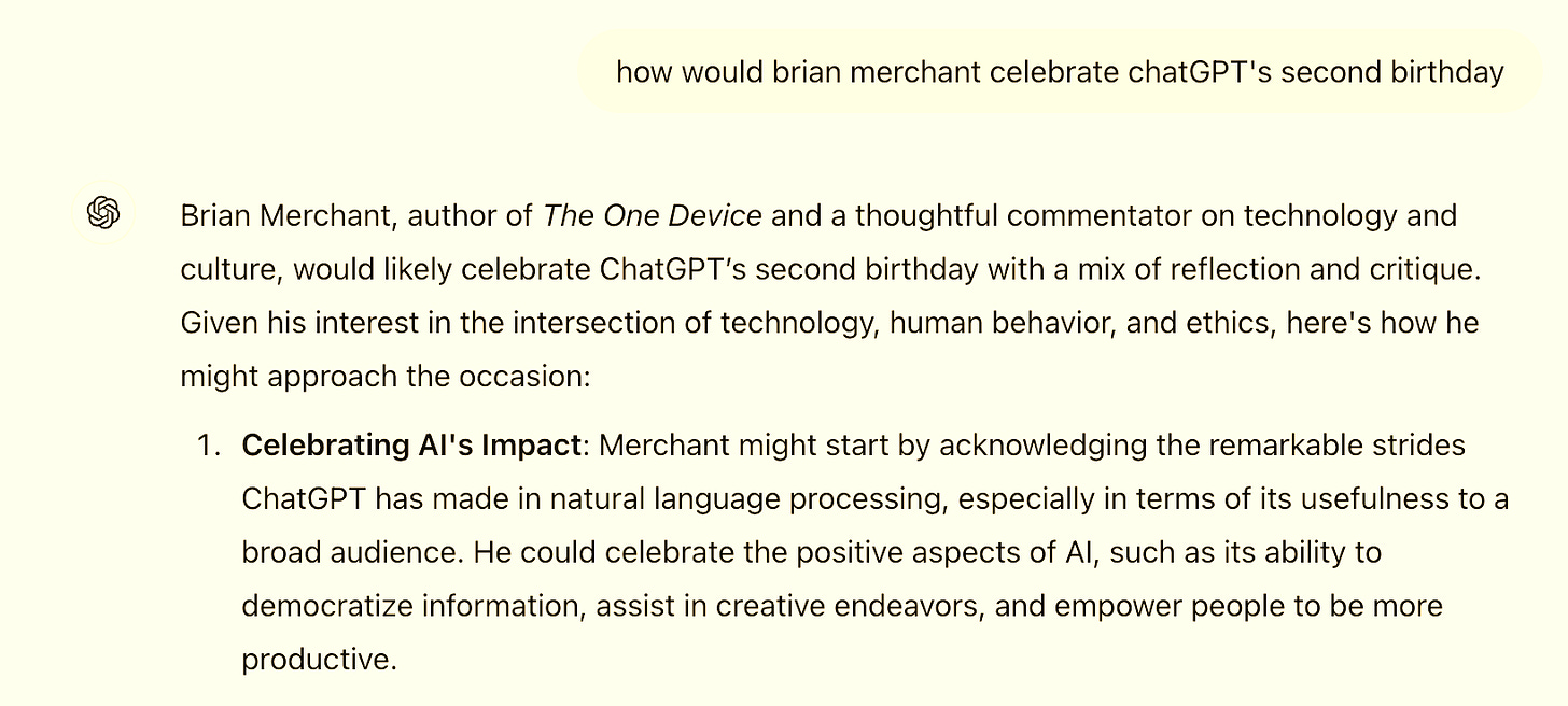 Meanwhile, the hallucinations, demonstrable errors, and erratic output that plagued early models were supposed to be fixed by now. They absolutely have not been, as Whittaker and co, and other critics like Gary Marcus have pointed out repeatedly, and instead persist to this day. To that end, here is one tiny example, in how ChatGPT output stated I might celebrate its birthday, despite, of course, having published reams and reams of criticism about it over the last two years.