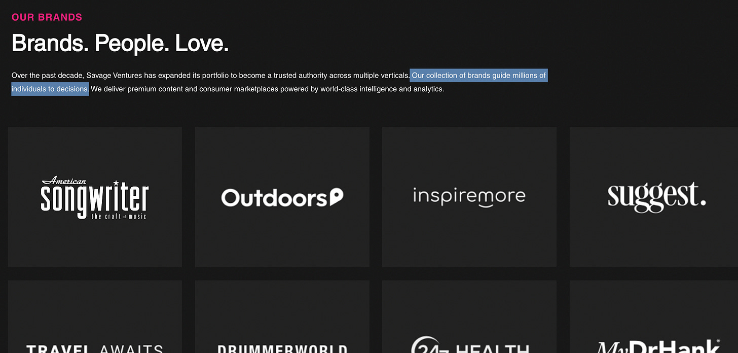 Fortunately for what remains of Vice’s leadership, Savage appears to have a penchant for churning out low grade and AI-generated content. A quick tour through its portfolio of web offerings, which include something called MyDrHank, domain name jackpot Outdoors.com, the weight loss supplement-hocking 247 Health, is utterly depressing. The hope is surely that Savage can use Vice’s presumably primo page rankings to further juice its business of auto-slopping blogs stuffed with affiliate links and autoplay ads into every available pore online and squeeze a little more value from its corpse before it fully biodegrades.