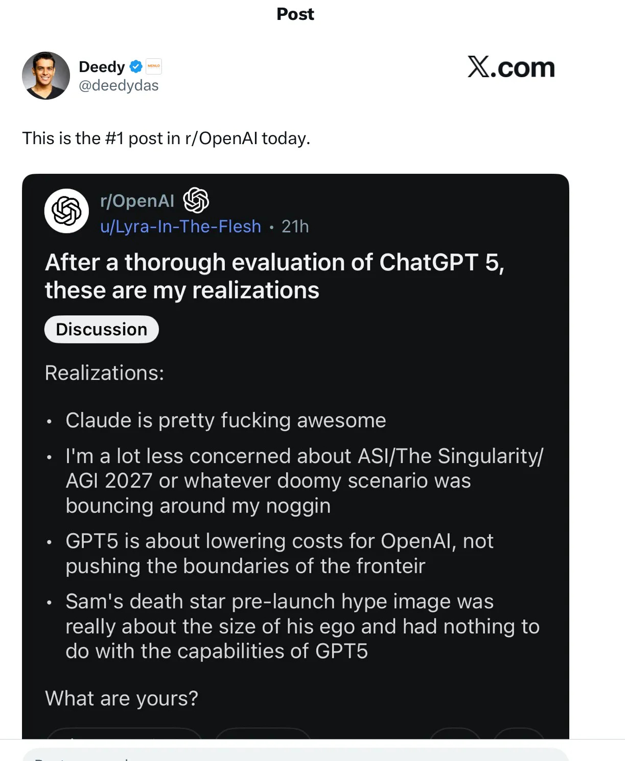 I don’t think the GPT-5 flop ultimately matters all that much to most folks, and it can certainly be papered over well enough by a skilled salesman in an enterprise pitch meeting. Again, all this is clarifying: OpenAI is again centering workplace automation, while retreating from messianic AGI talk. Here’s NBC, in a story about how Altman has apparently and rather suddenly (once again) changed his stance on AGI: