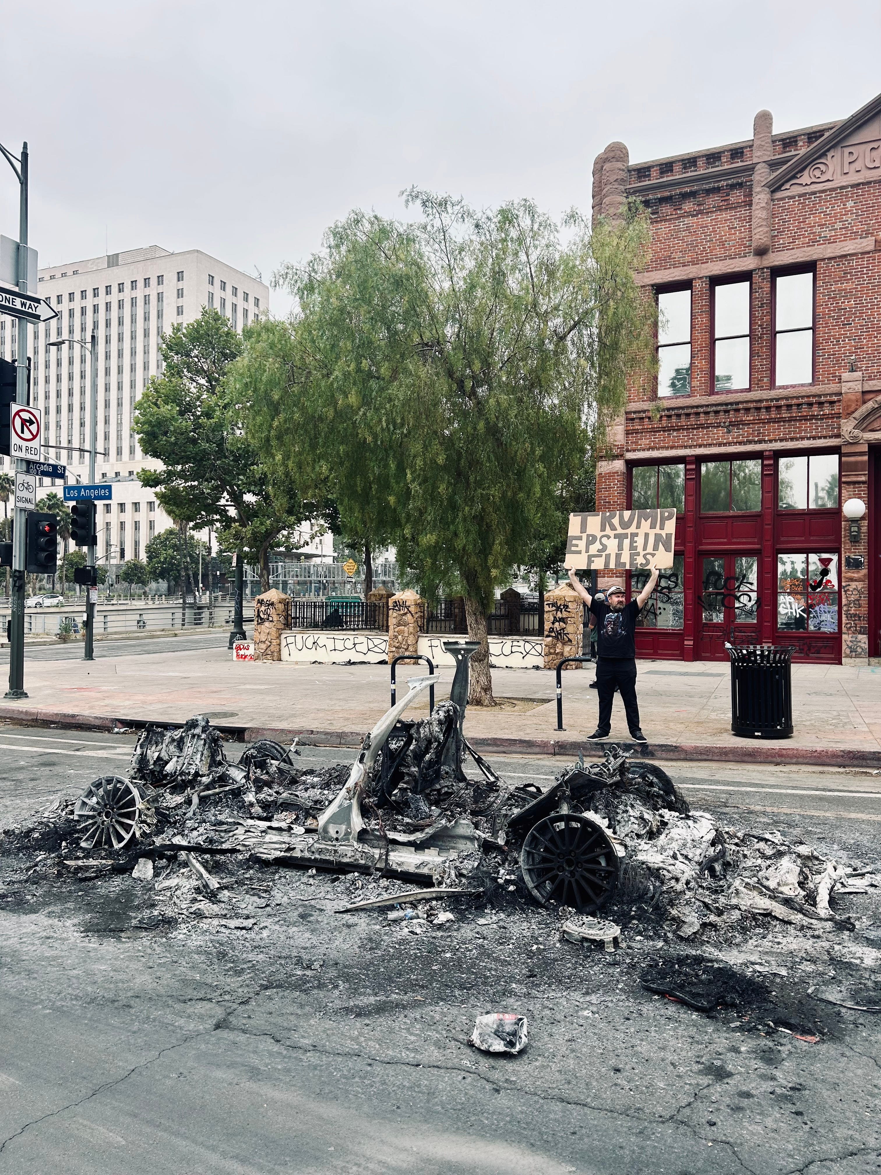 “Oh they called them up on purpose, lit ‘em on fire like that,” a cameraman shooting on the scene the next day told me. The charred husks in a neat line do seem to suggest that was the case. Other witnesses and journalists who were there shared the same story: People summoned the cars to light them on fire when they arrived. Protestors were reportedly calling them “spy cars” as they were vandalized and set ablaze, and some noted how the cars can share data with the LAPD.