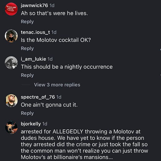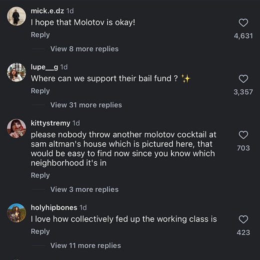 On the morning of Friday, April 10th, a 20 year-old Texas man named Daniel Alejandro Moreno-Gama was arrested for allegedly throwing a molotov cocktail at Sam Altman’s mansion on Russian Hill in San Francisco. Less than two days later, police arrested 25 year-old Amanda Tom and 23 year-old Muhamad Tarik Hussein for allegedly firing a gun at the same house from their car before speeding away.