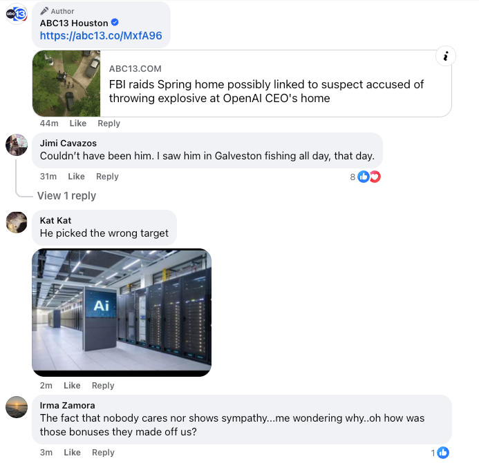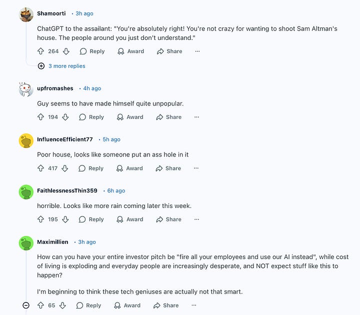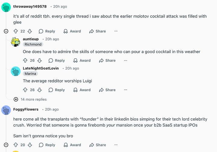 That staunchly negative sentiment was reflected in the posts that proliferated on social media, Reddit, and comment sections across the internet after the attacks on Altman’s home. It was all more than a little reminiscent of the reaction to the killing of UnitedHealthCare CEO Brian Thompson last year, which saw an outpouring of online support for the executive’s accused killer, Luigi Mangione, that took many by surprise.